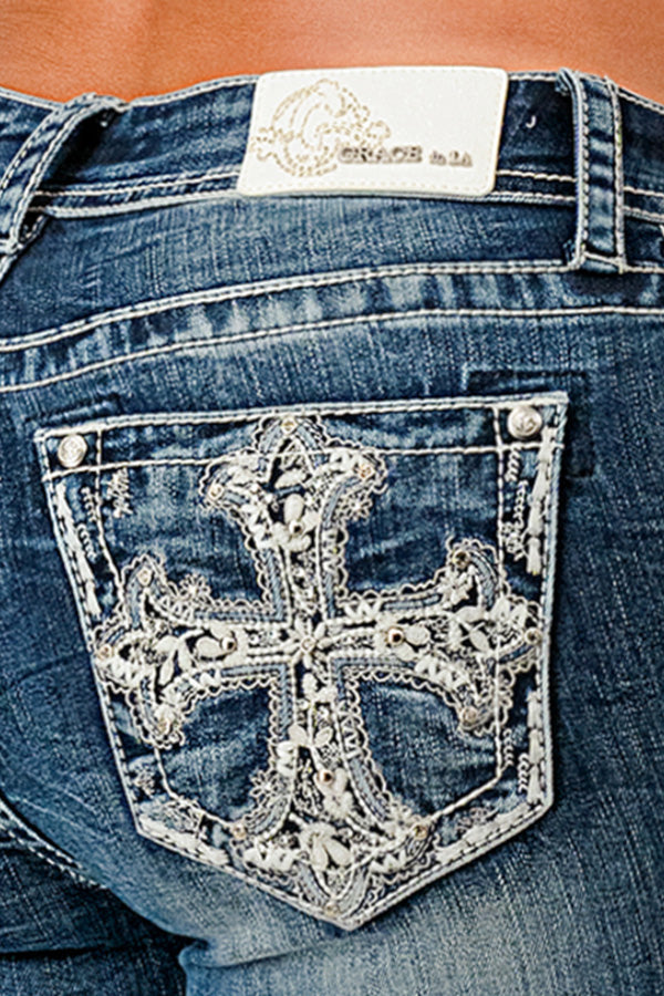 The Grace in LA women’s bootcut jean in  sits right at the waist to create a hip hugger feel on the hips and thighs. The jean is detailed with a cross embroidered design on the back pockets and added embellishment on the front pockets, natural hand-sanding, and whiskering.  The denim fabric has the perfect amount of stretch and great holding power.