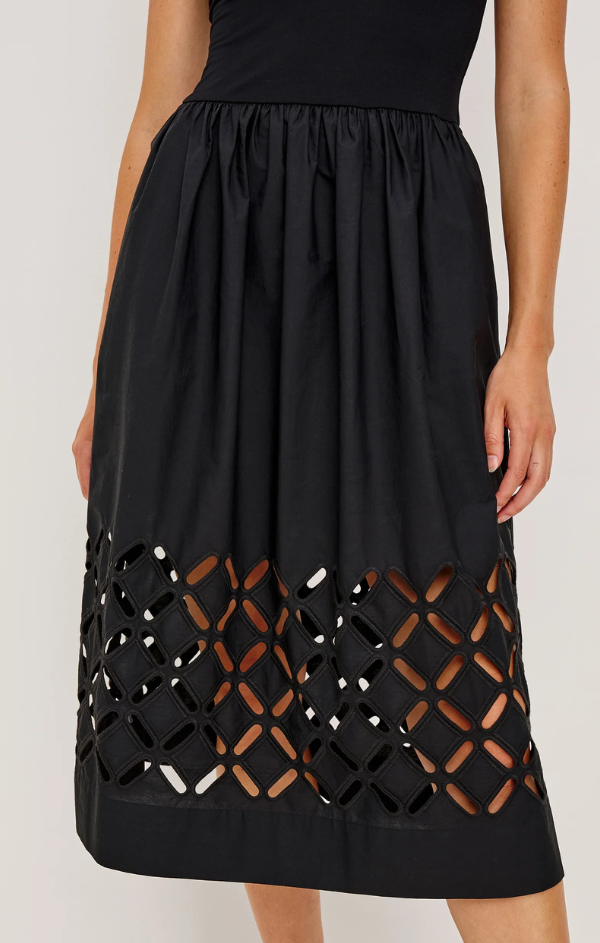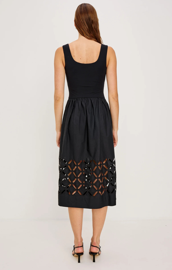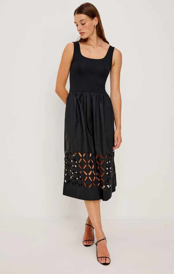 Step into sophistication with the Nadya Dress, an effortlessly elegant black midi featuring daring cutouts from mid-skirt to hem. This playful design adds a flirty edge to your look, making it perfect for turning heads at any event while keeping your style sleek and bold.Style with heels and a bold beaded clutch.
