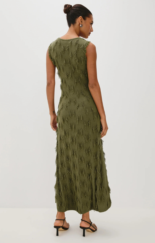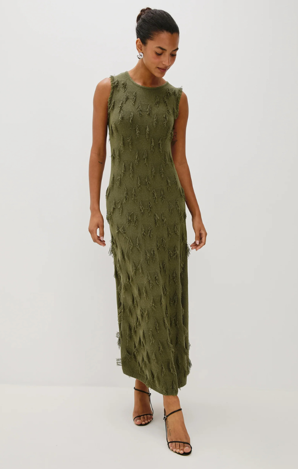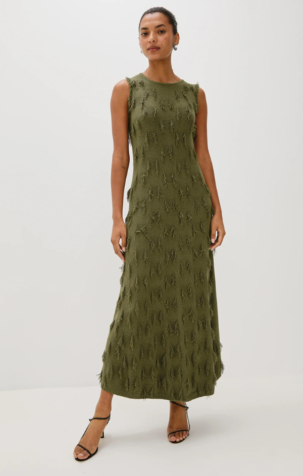 Elevate your fall wardrobe with the Trivento Dress, a chic olive green maxi that dazzles with playful fringed details and a flattering A-line silhouette. A perfect fall wedding look that makes a subtle statement. Style with heels and gold earrings.Â